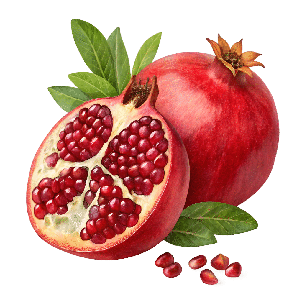 This fruit is medium to large in size with a nearly round shape. It features a deep pink, leathery skin, while its interior contains white, spongy tissue that divides the fruit into compartments. Each compartment is filled with sacs holding sweet-tart, juicy, dark pink seeds. These tiny seeds are fully edible, offering a crunchy texture and a berry-like, naturally sweet flavor.